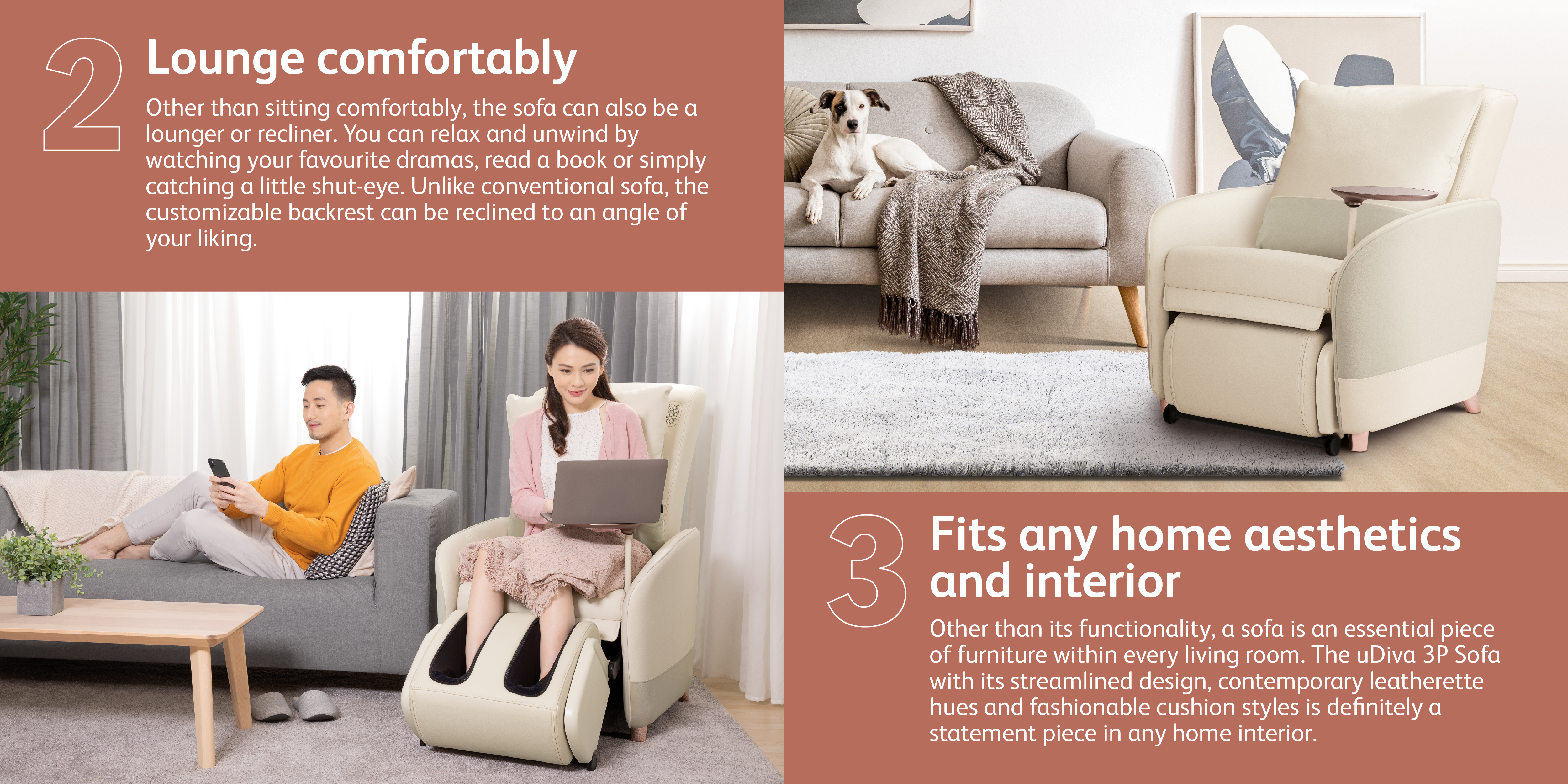 The uDiva 3 Plus massage sofa comes with a matching cushion for a sleek, polished look.